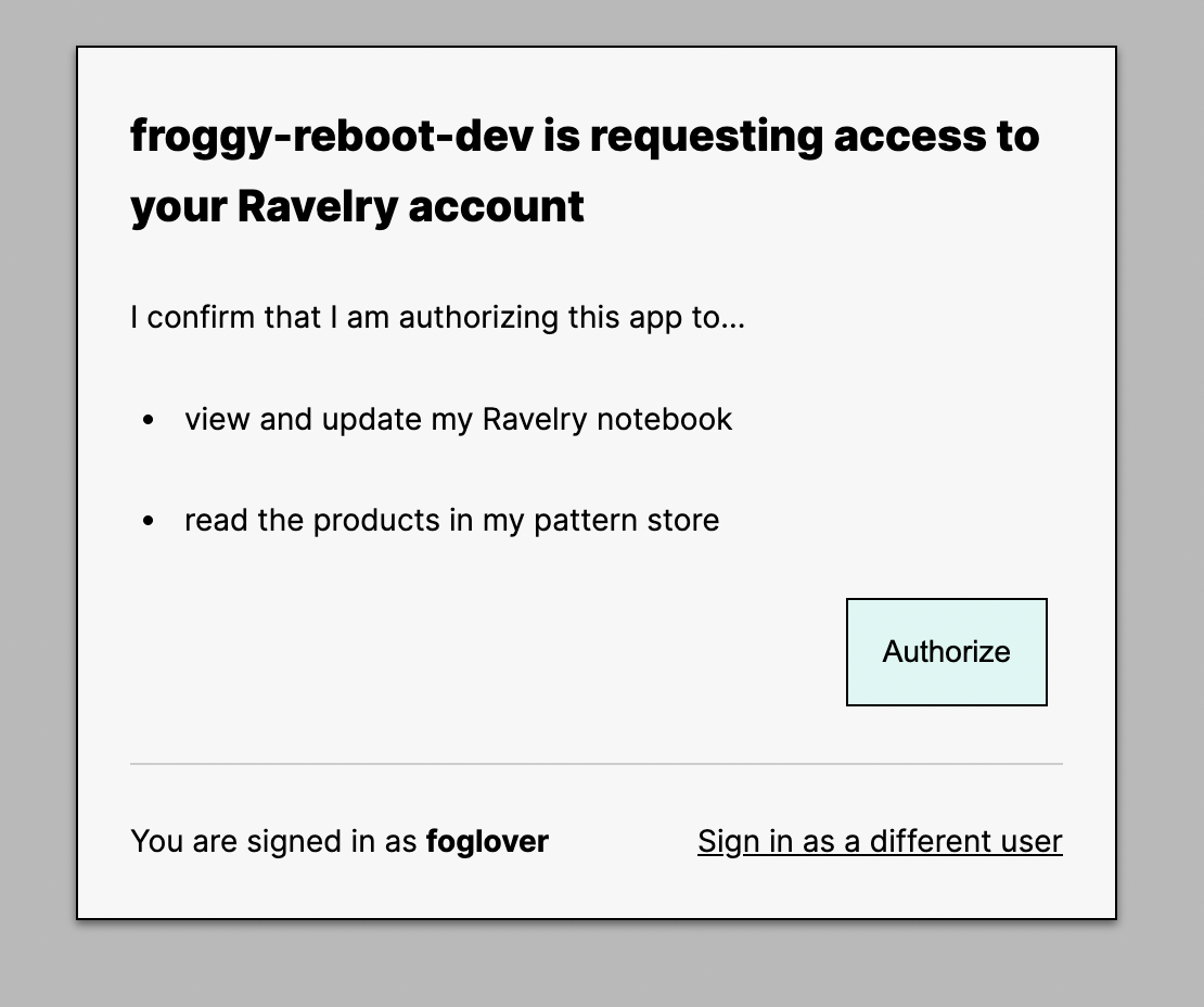 프론트엔드에서 ravelry 로그인 버튼을 누르면 이런식으로 동의 화면을 띄워줘야 한다.