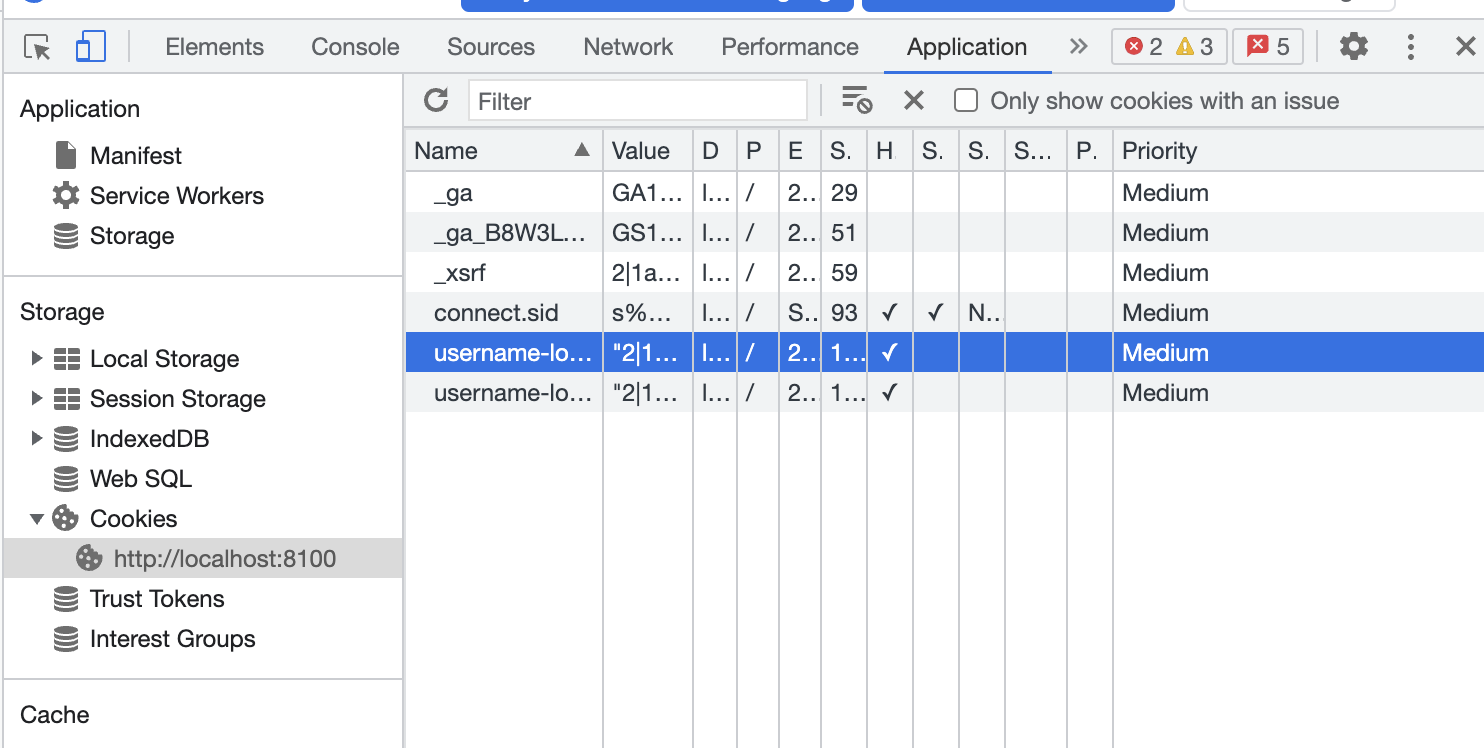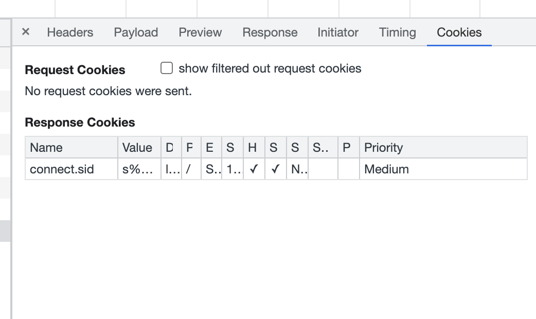 브라우저에 connect.sid값이 잘 저장되었는지는 chorme 개발자도구 > Application > Cookies에 가면 확인할 수 있다.